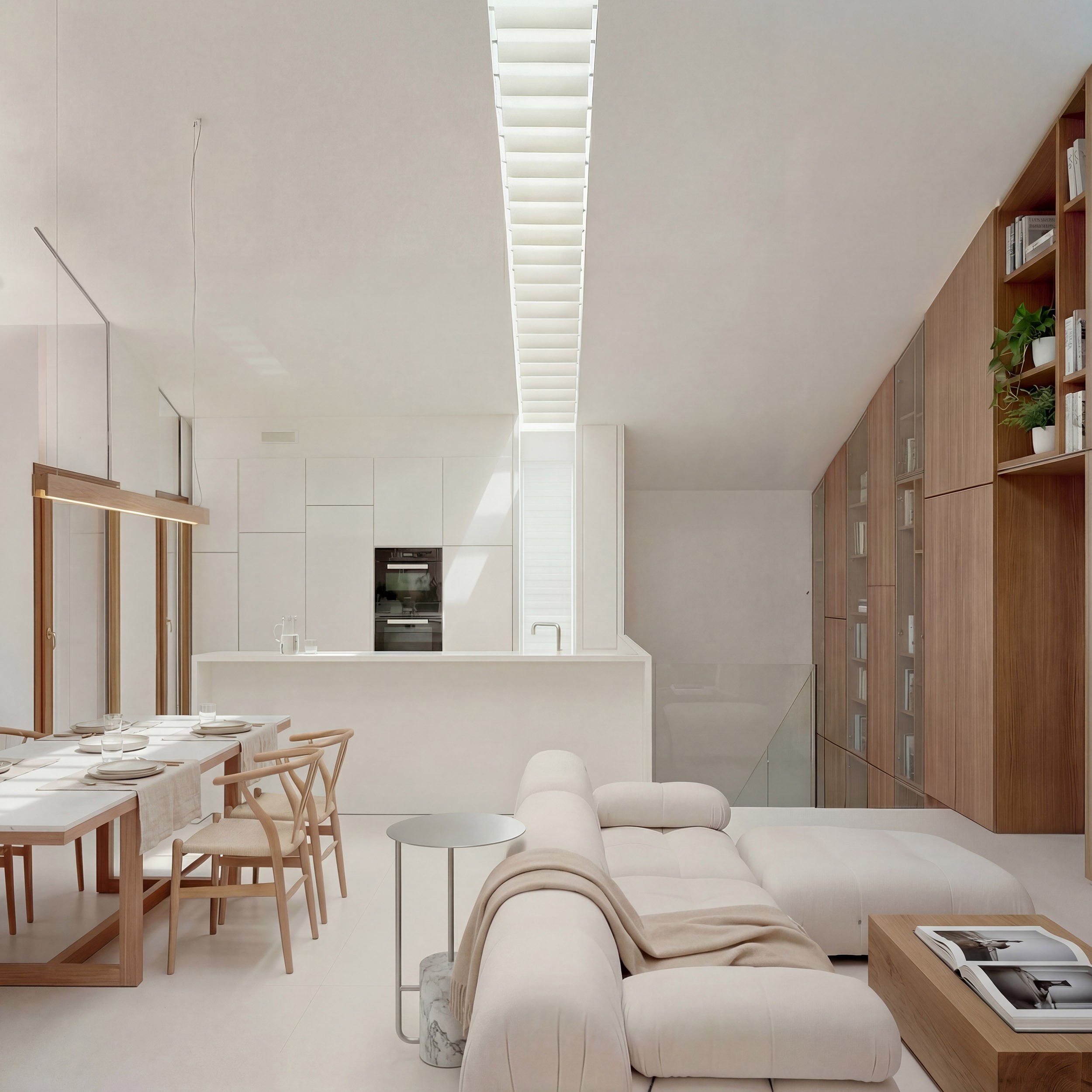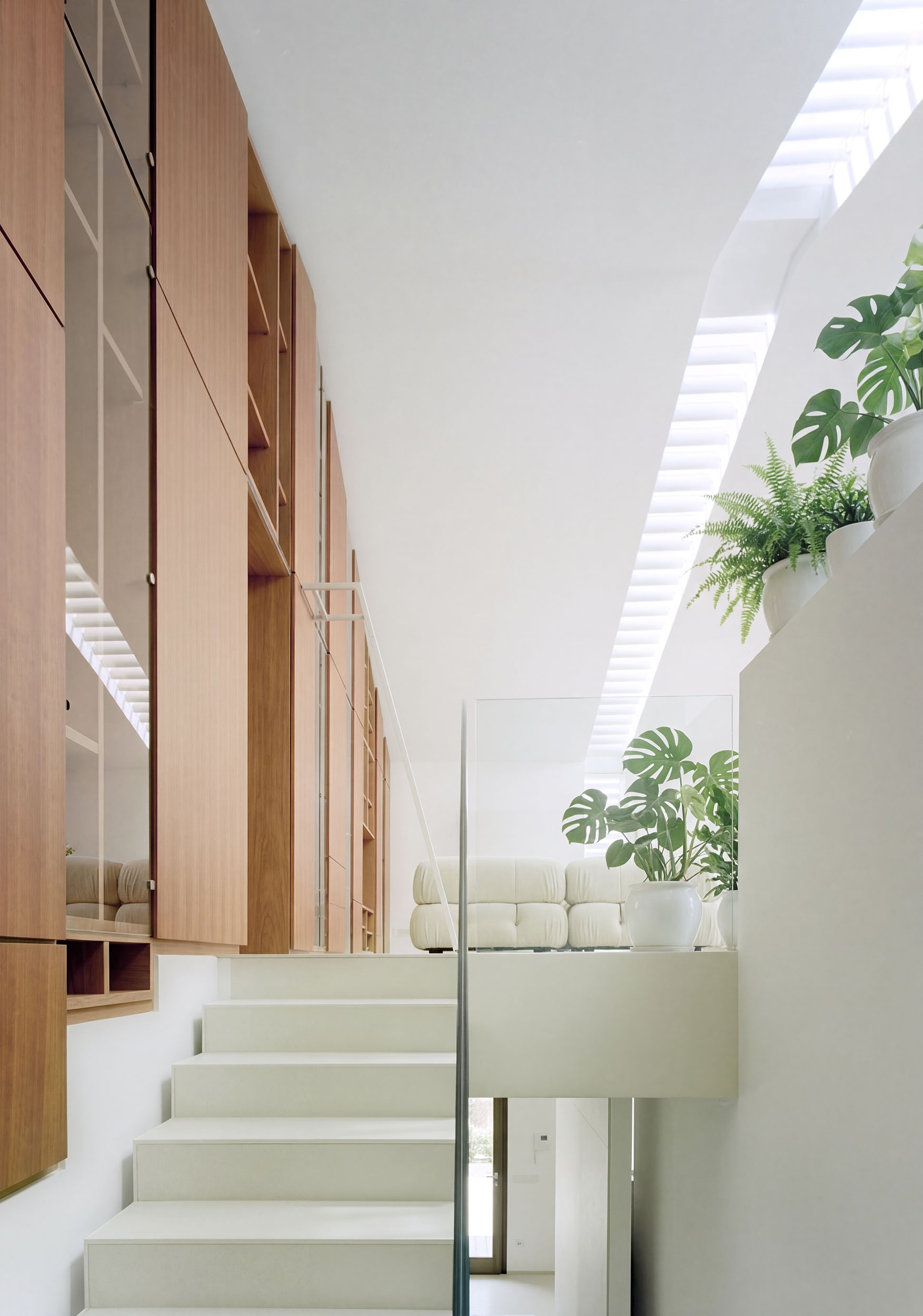 Se all’esterno la casa si presenta compatta, quasi introversa, all’interno i tagli di luce costruiscono atmosfera, profondità, vita quotidiana. Le fenditure verticali portano luce diffusa e mutevole, accompagnano i percorsi, definiscono le soglie, dilatano gli spazi di relazione. La luce non entra semplicemente: scava, modella, attraversa. Gli ambienti prendono carattere proprio grazie a questi vuoti, che diventano dispositivi emotivi prima ancora che funzionali: luoghi intermedi dove l’interno percepisce il cielo, dove il tempo si misura attraverso le ombre, dove la casa smette di essere solo un volume ricostruito e diventa esperienza.