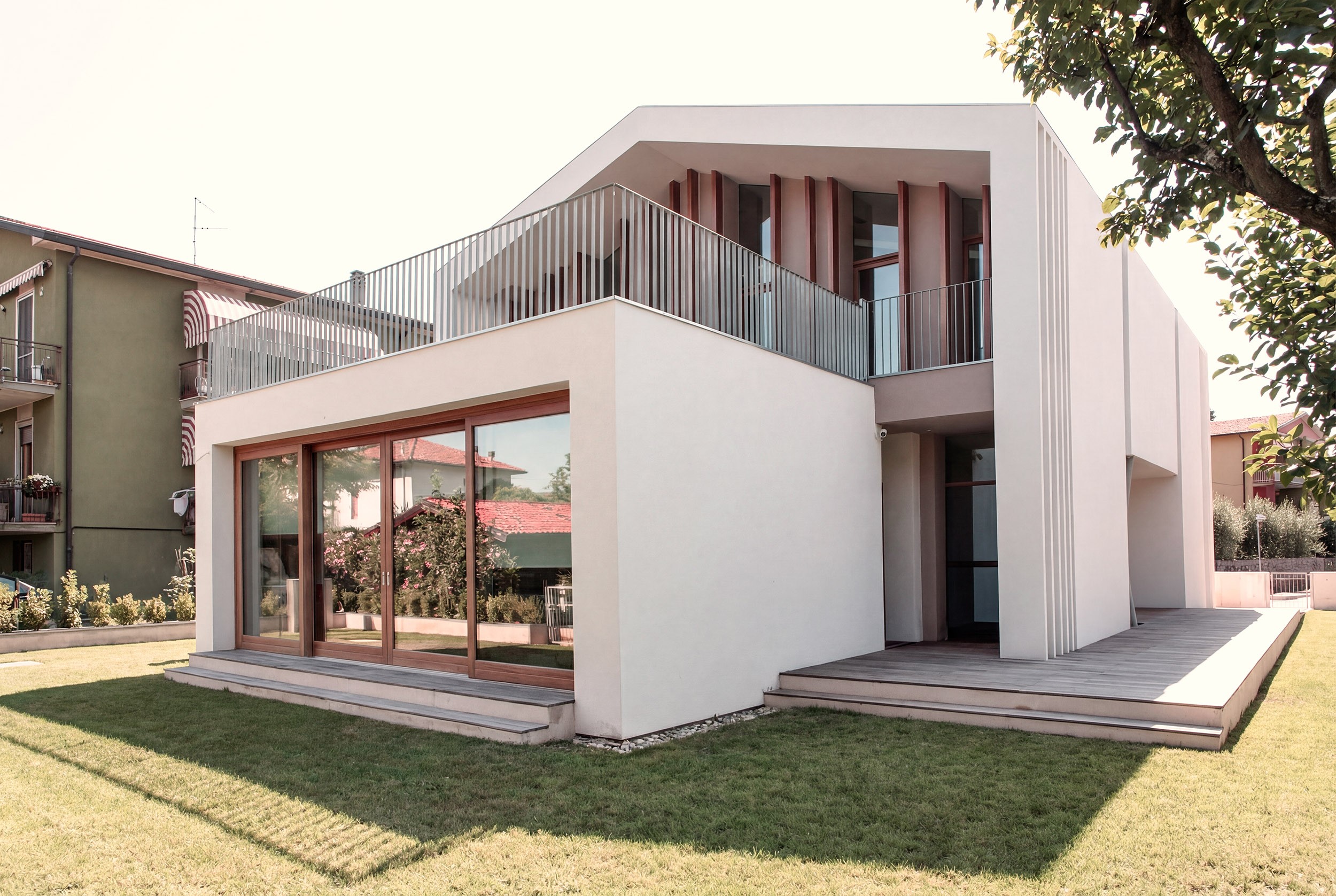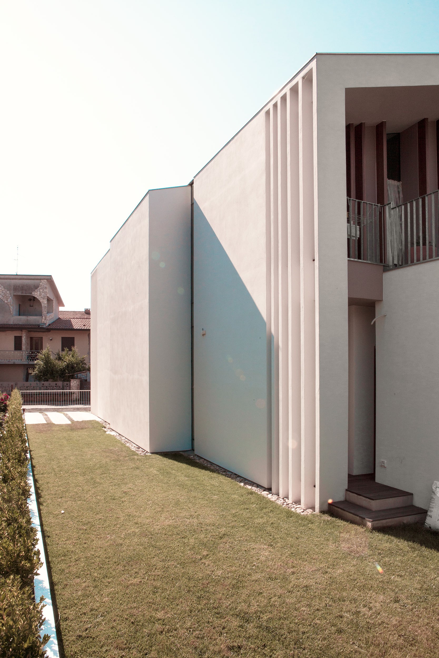 Il vincolo volumetrico non viene subìto, ma trasformato in opportunità narrativa e spaziale. L’archetipo della casa a due falde viene reso essenziale, quasi astratto, come un segno puro sospeso nel tempo. Poi, dentro questa purezza, il progetto sceglie di lavorare per incisione: nei punti in cui la vecchia costruzione arretrava o cambiava geometria, nascono fenditure verticali che scaldano il volume e lo articolano. Queste fratture luminose definiscono la misura degli spazi, mettono in tensione i diversi corpi edilizi e costruiscono una percezione sfalsata e dinamica del prospetto. L’edificio diventa così un’architettura fatta di pieni e interruzioni, di materia e di respiro, dove l’essenzialità formale convive con una complessità percettiva sottile e raffinata.