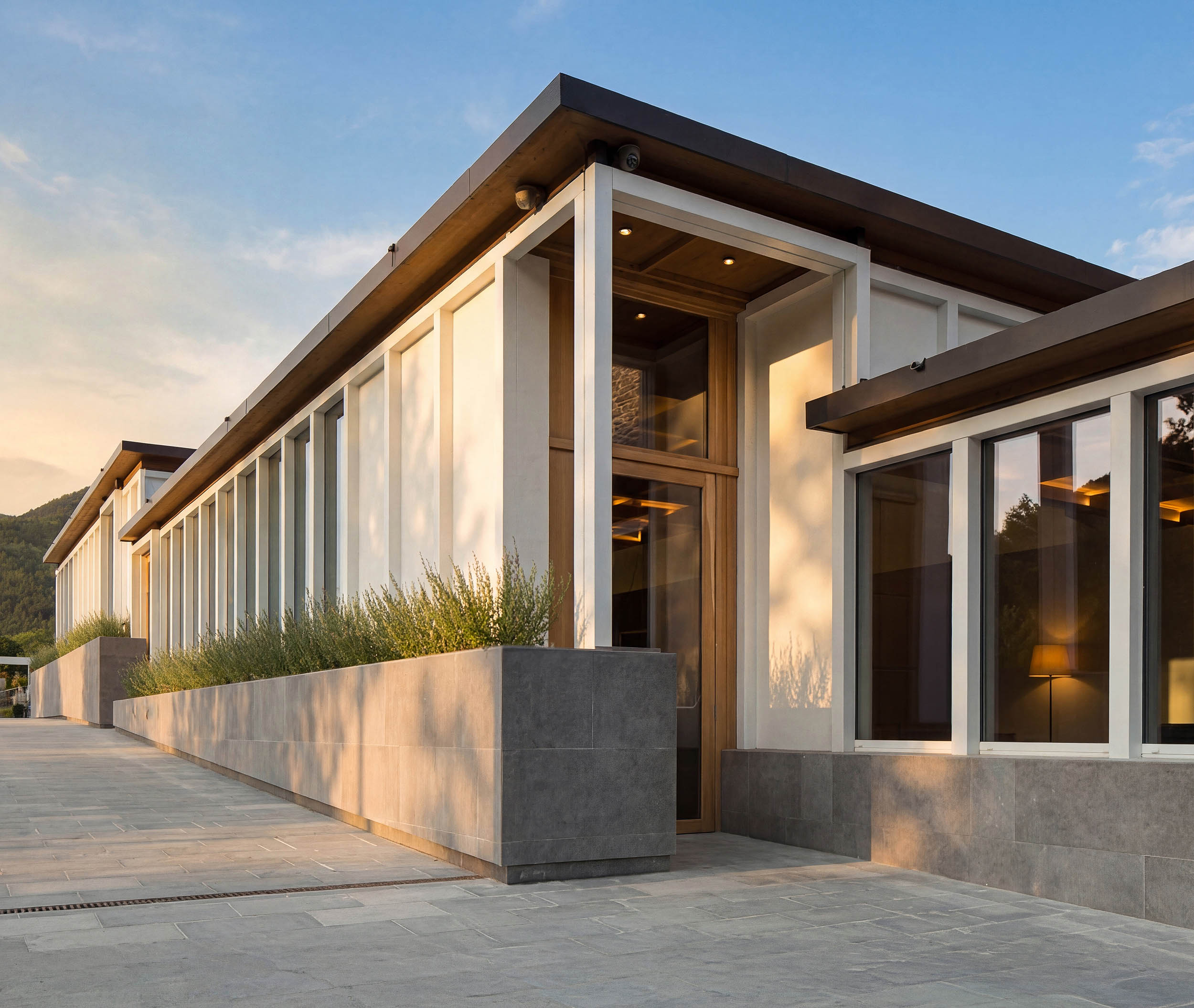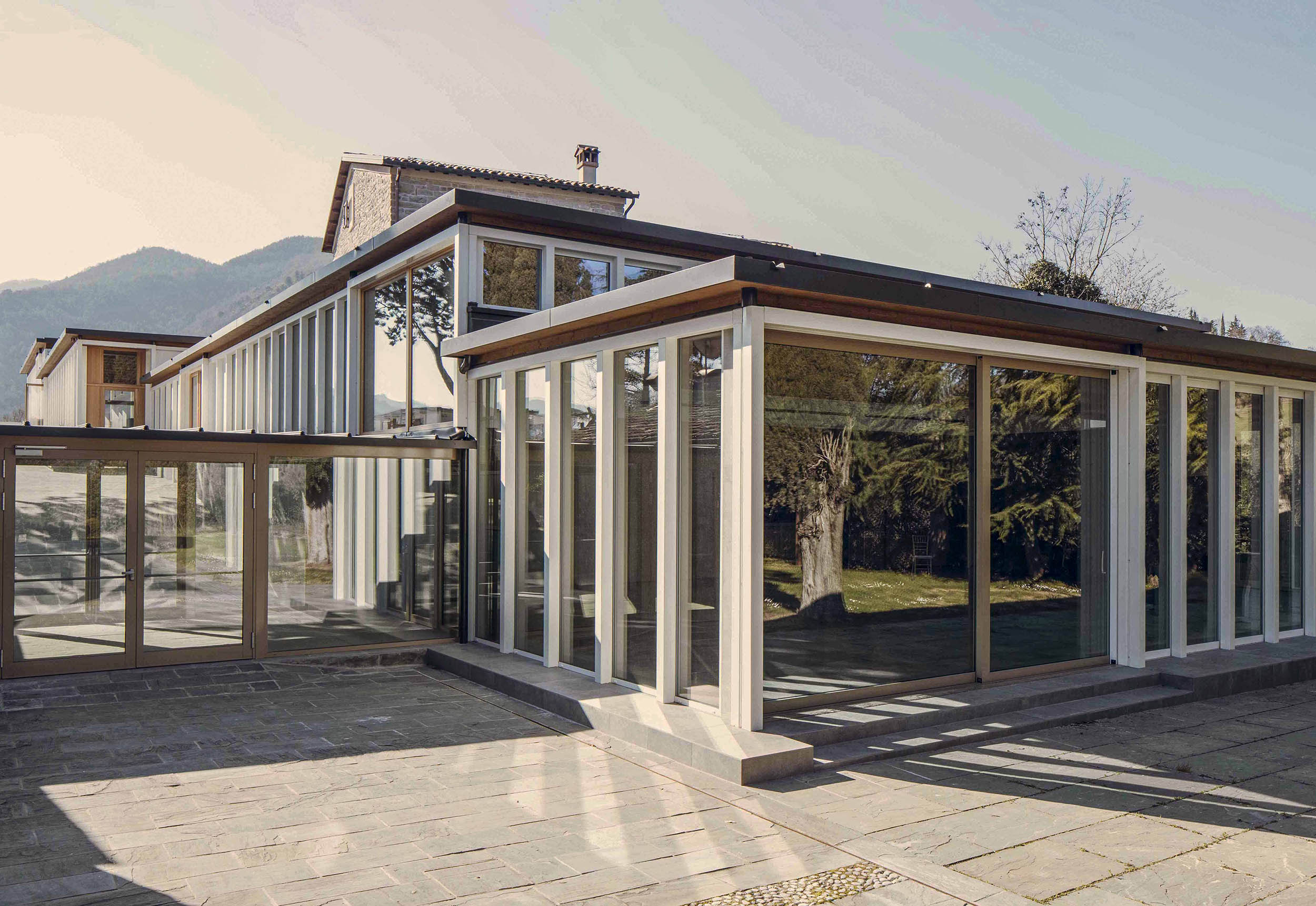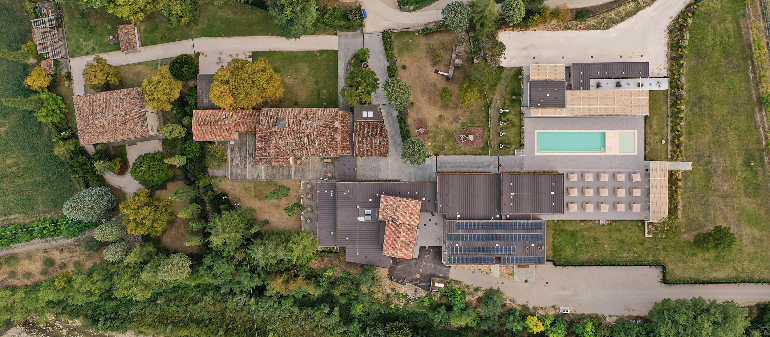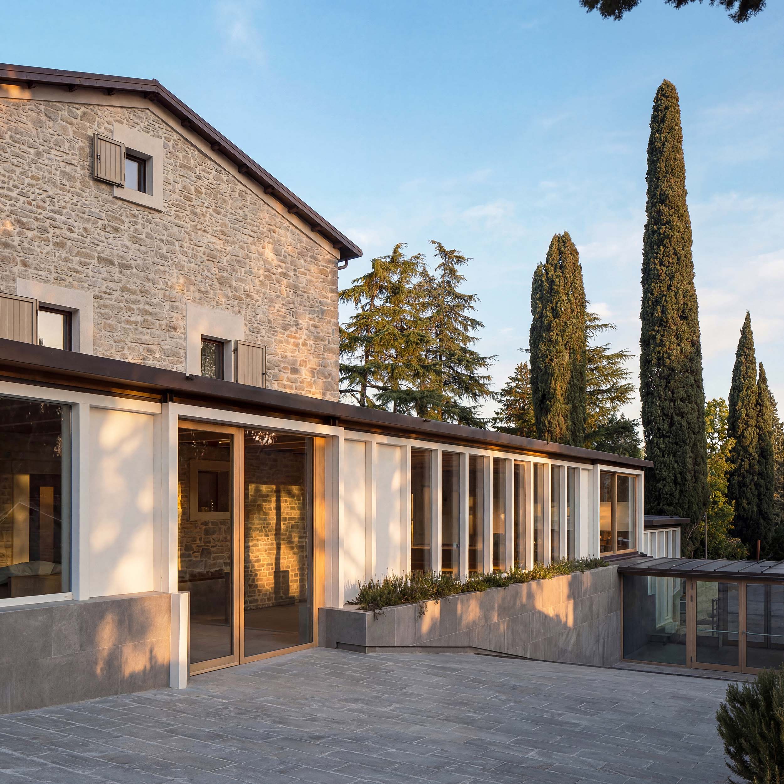 Un progetto di ampliamento che integra un nuovo centro benessere e una piscina nel paesaggio collinare, dialogando con il nucleo storico attraverso l'uso della topografia e una palette materica naturale.