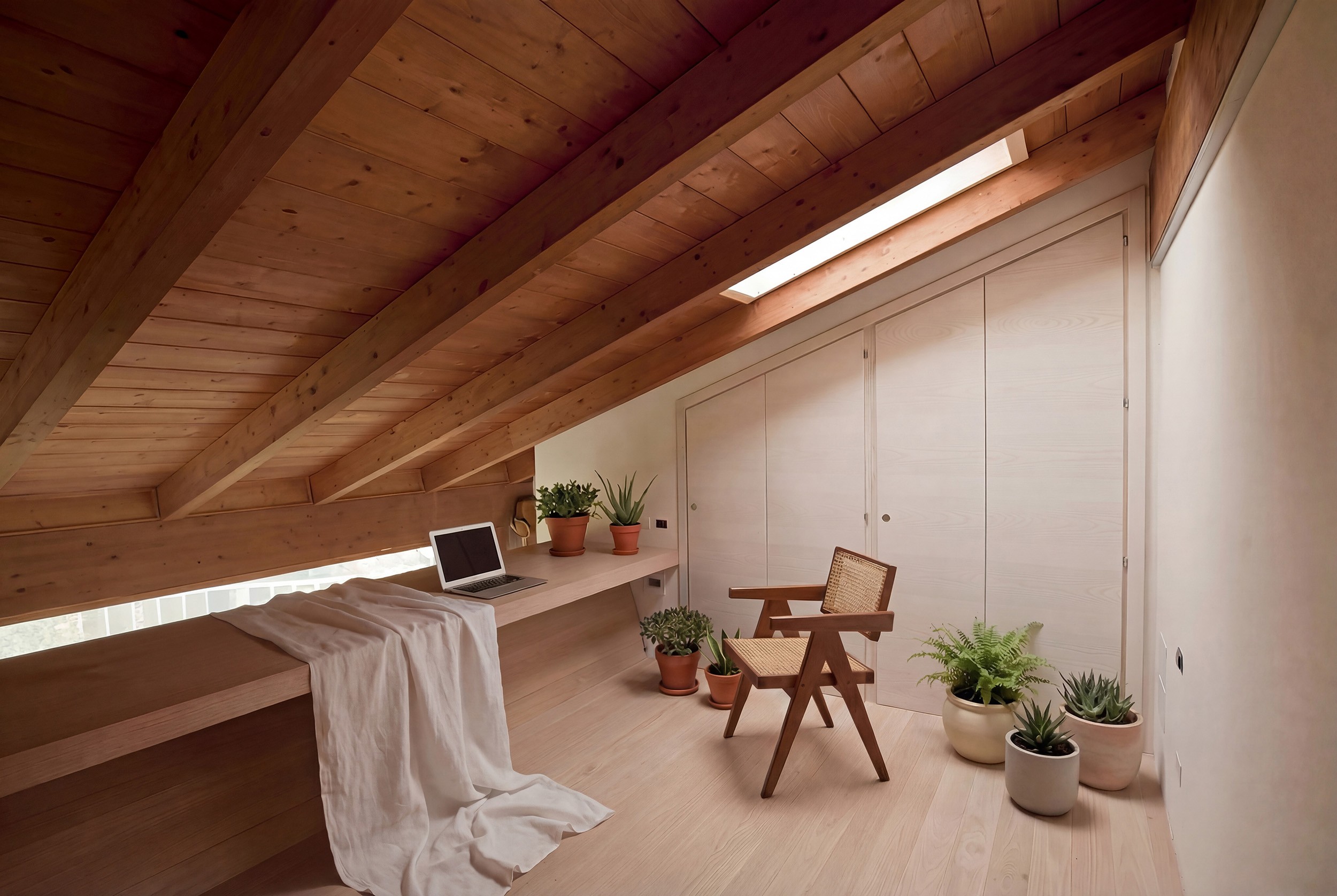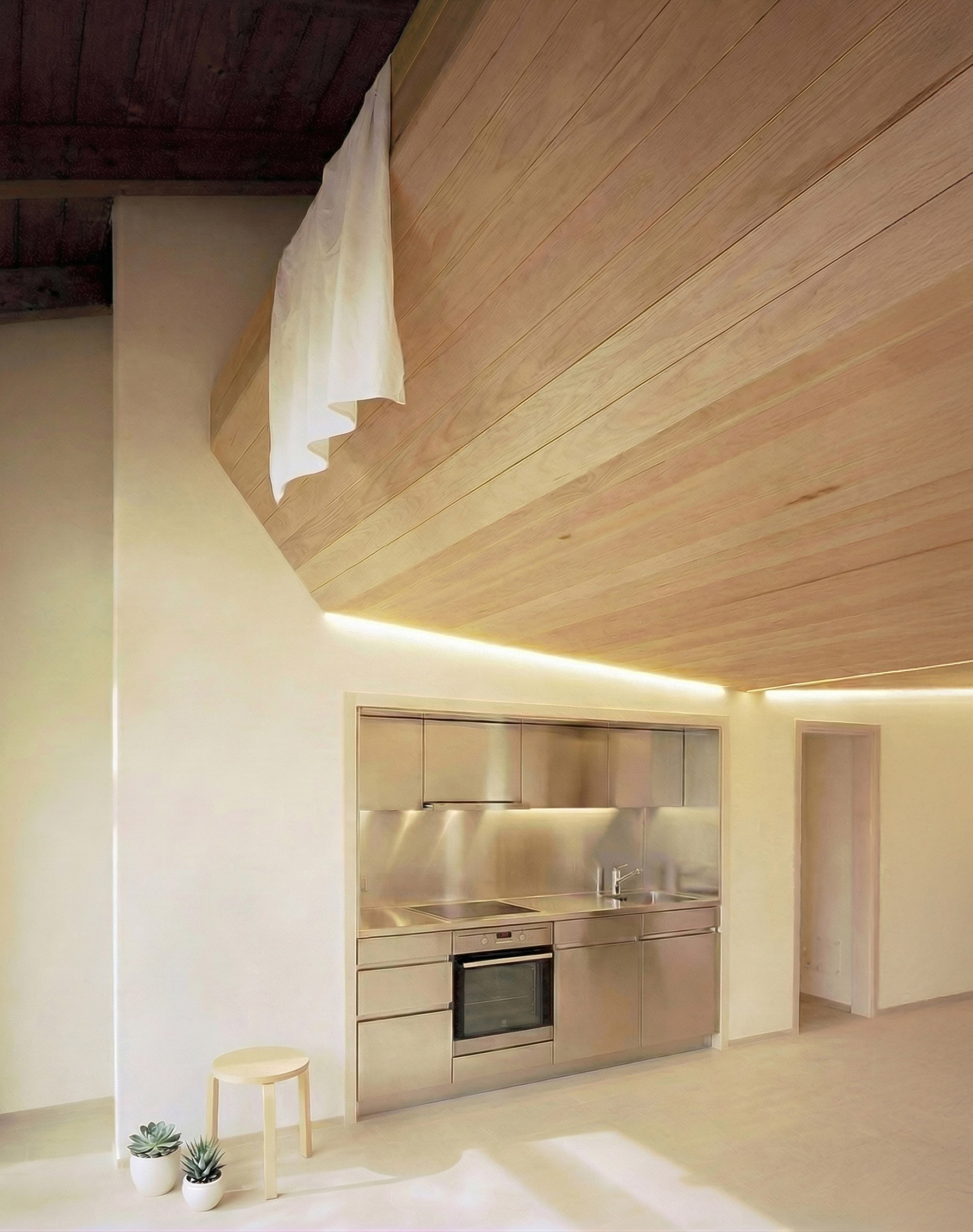 Il progetto lavora per compressione ed espansione. Le funzioni più tecniche si addossano ai margini, mentre lo spazio centrale rimane libero e attraversabile, mantenendo una forte continuità visiva lungo l’asse longitudinale. Al piano terra si concentrano la zona conviviale e la cucina; sopra, un soppalco intimo ospita lo studio e la zona notte. Il soffitto del soppalco diventa il vero gesto architettonico del progetto. Rivestito in assi di legno e sagomato come una chiglia rovesciata, guida lo spazio e lo mette in tensione verso l’esterno. La superficie lignea si piega, diventa scrivania, accompagna lo sguardo e accelera la prospettiva, come se l’architettura stessa spingesse il paesaggio all’interno. È in questo equilibrio tra densità e apertura che lo spazio trova la propria identità.