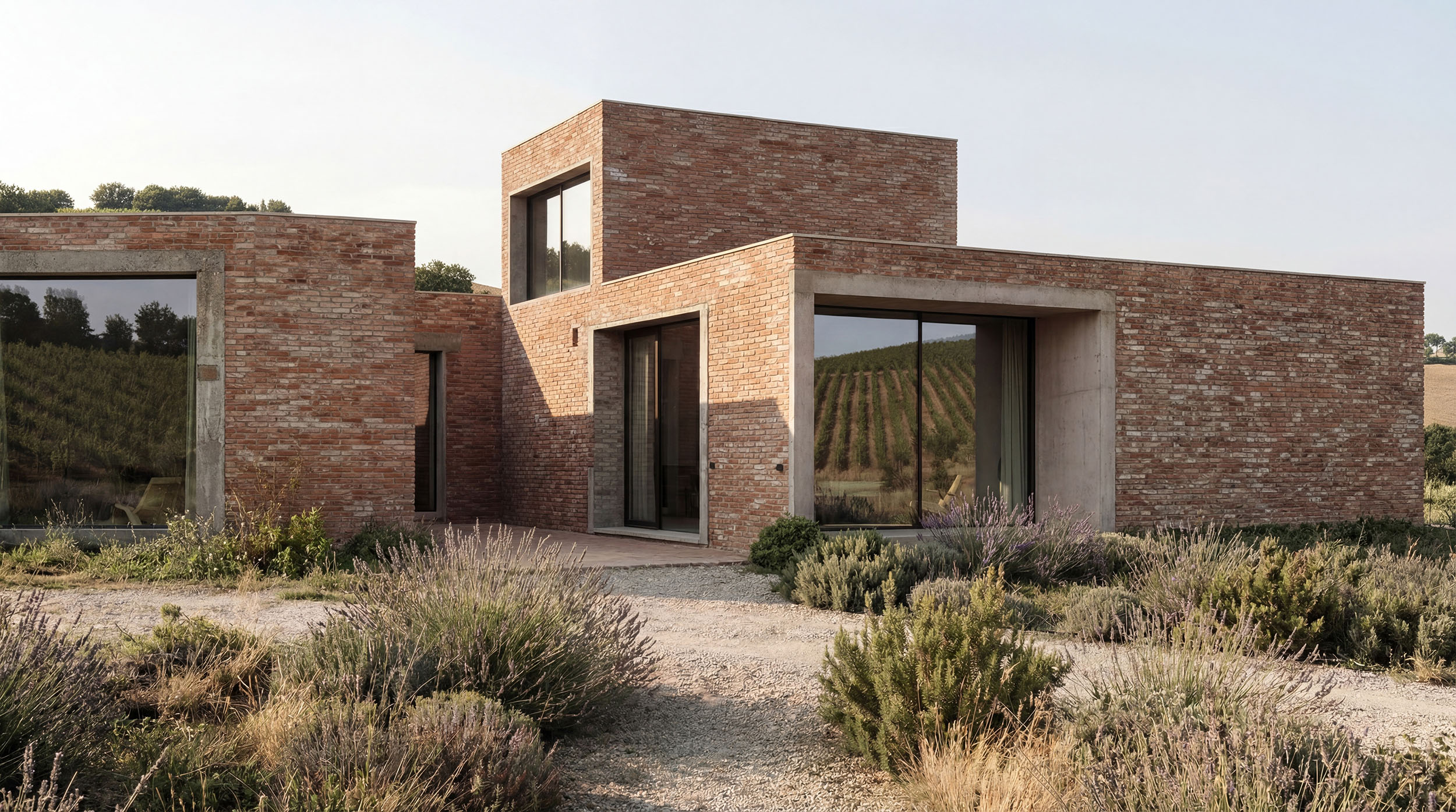 La struttura è realizzata in calcestruzzo armato, lasciato a vista in alcune parti, con involucro esterno in laterizio faccia a vista. Le coperture piane rafforzano la lettura dei corpi come forme pure, mentre le aperture sono calibrate per garantire controllo solare, spessore murario e continuità tra interno ed esterno.