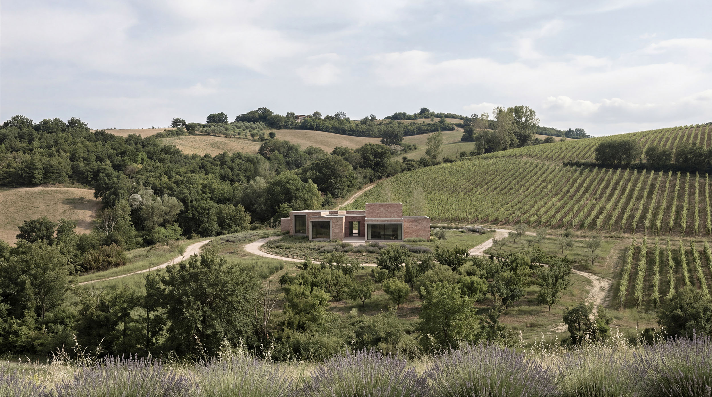 Ogni volume definisce uno spazio specifico e si relaziona direttamente con il contesto attraverso aperture misurate, profondamente incassate. Il nucleo costruito si posa sul terreno come una presenza astratta, leggibile come sistema, capace di crescere per addizione mantenendo invariata la propria regola formale.