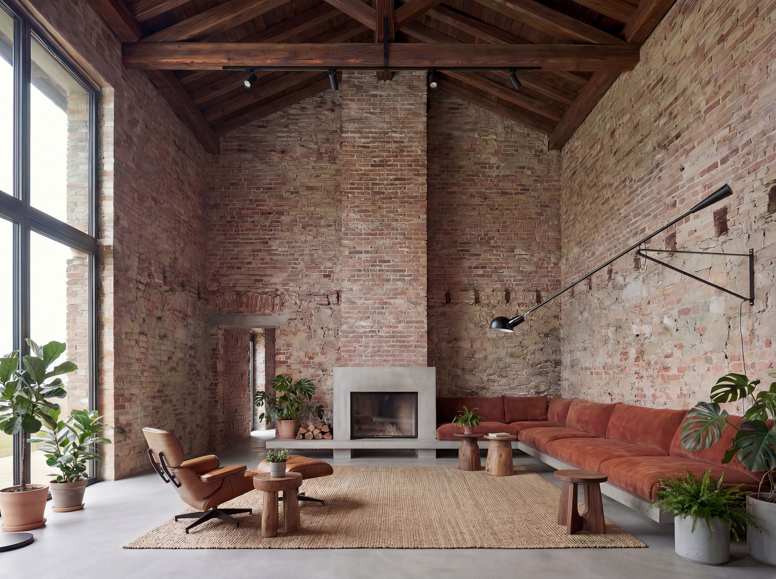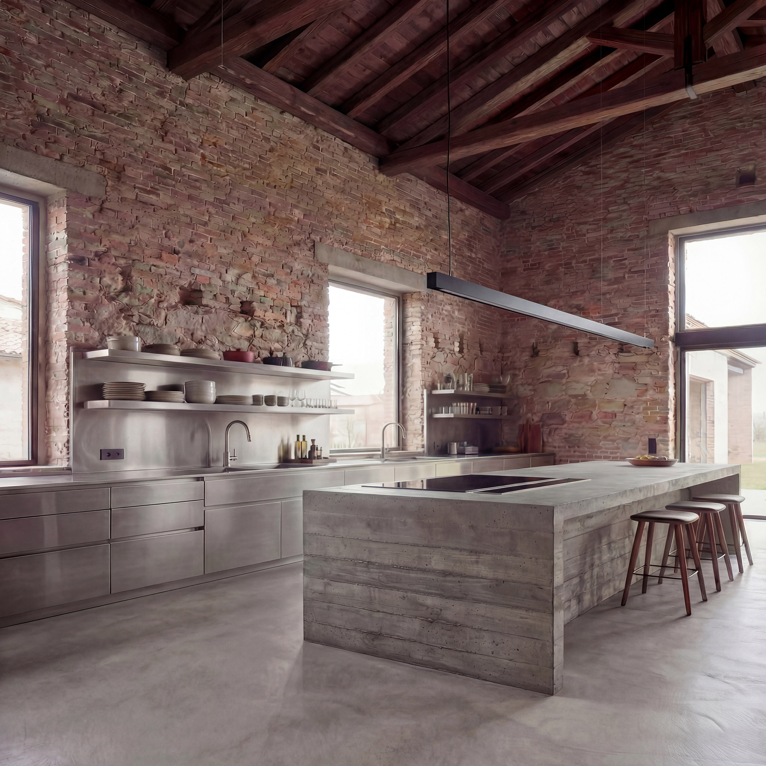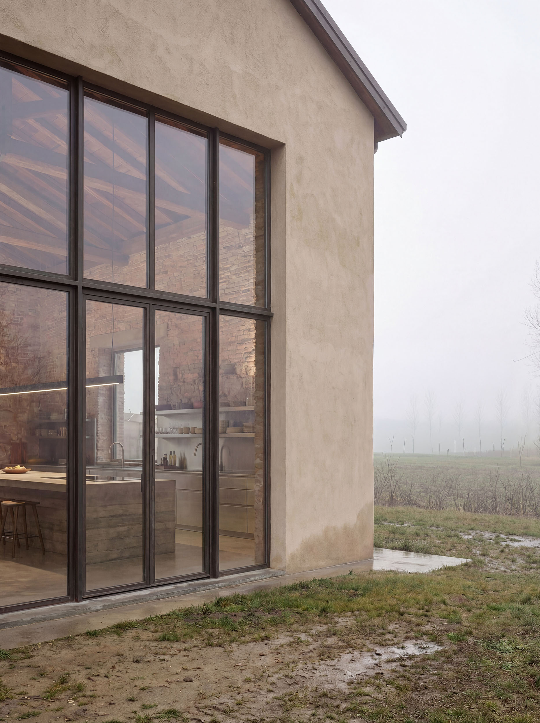 Il progetto nasce dalla volontà di non ridurre il capannone a una semplice “casa”, ma di conservarne l’anima spaziale. L’altezza, la profondità, la sequenza delle bucature diventano materia progettuale. Gli ambienti si organizzano per campi, non per stanze: cucina, tavolo, area giorno e spazi per gli ospiti convivono all’interno di un unico grande volume, scandito più dalla luce e dagli arredi che da vere separazioni. Le grandi finestre verticali mantengono il rapporto diretto con il paesaggio agricolo, trasformando la campagna in sfondo permanente della vita interna. Il laterizio lasciato a vista, il cemento, il legno della copertura costruiscono un’atmosfera densa ma essenziale, in equilibrio tra memoria rurale e comfort contemporaneo. È uno spazio pensato per accogliere: cene, incontri, silenzi condivisi.