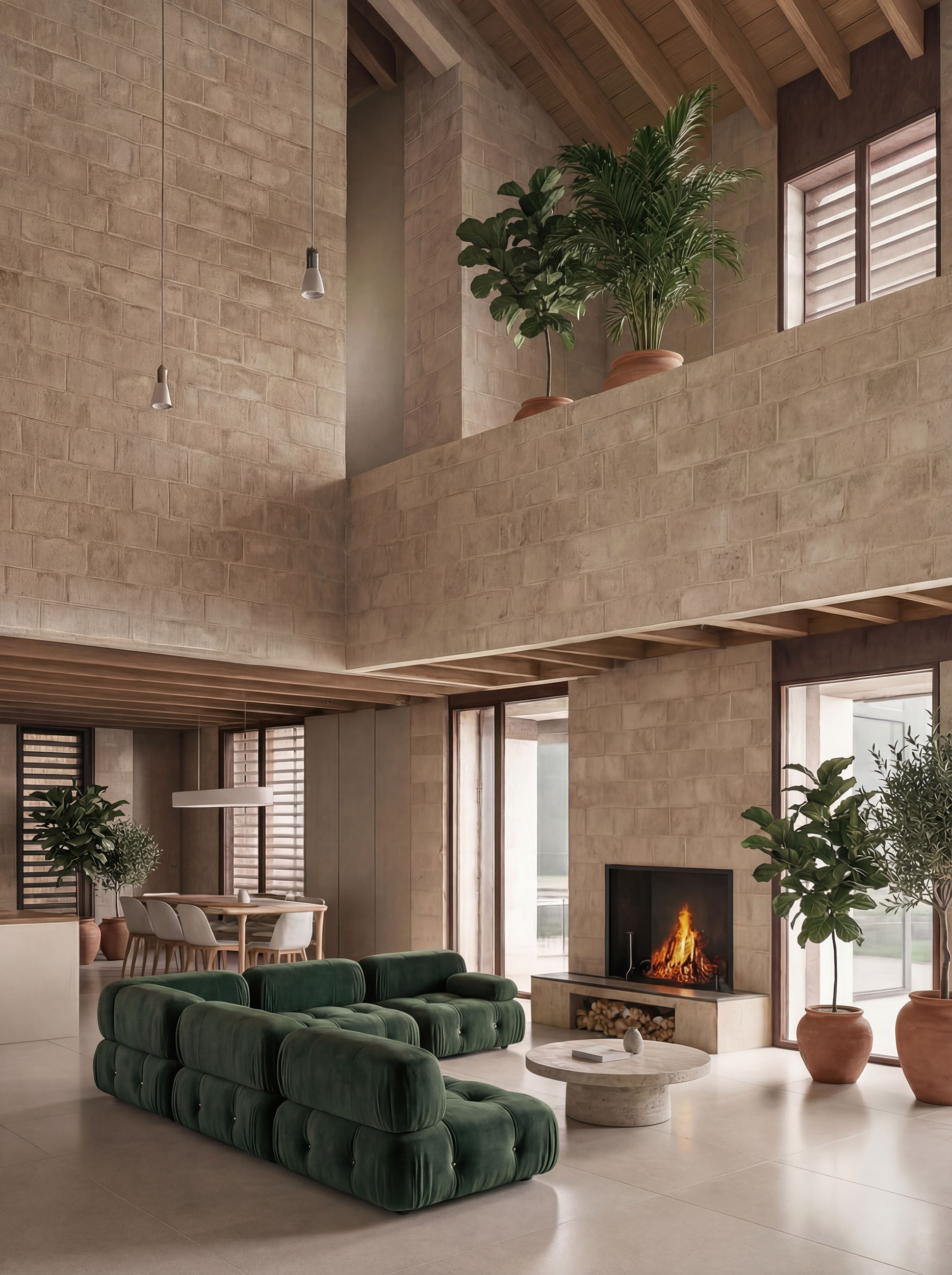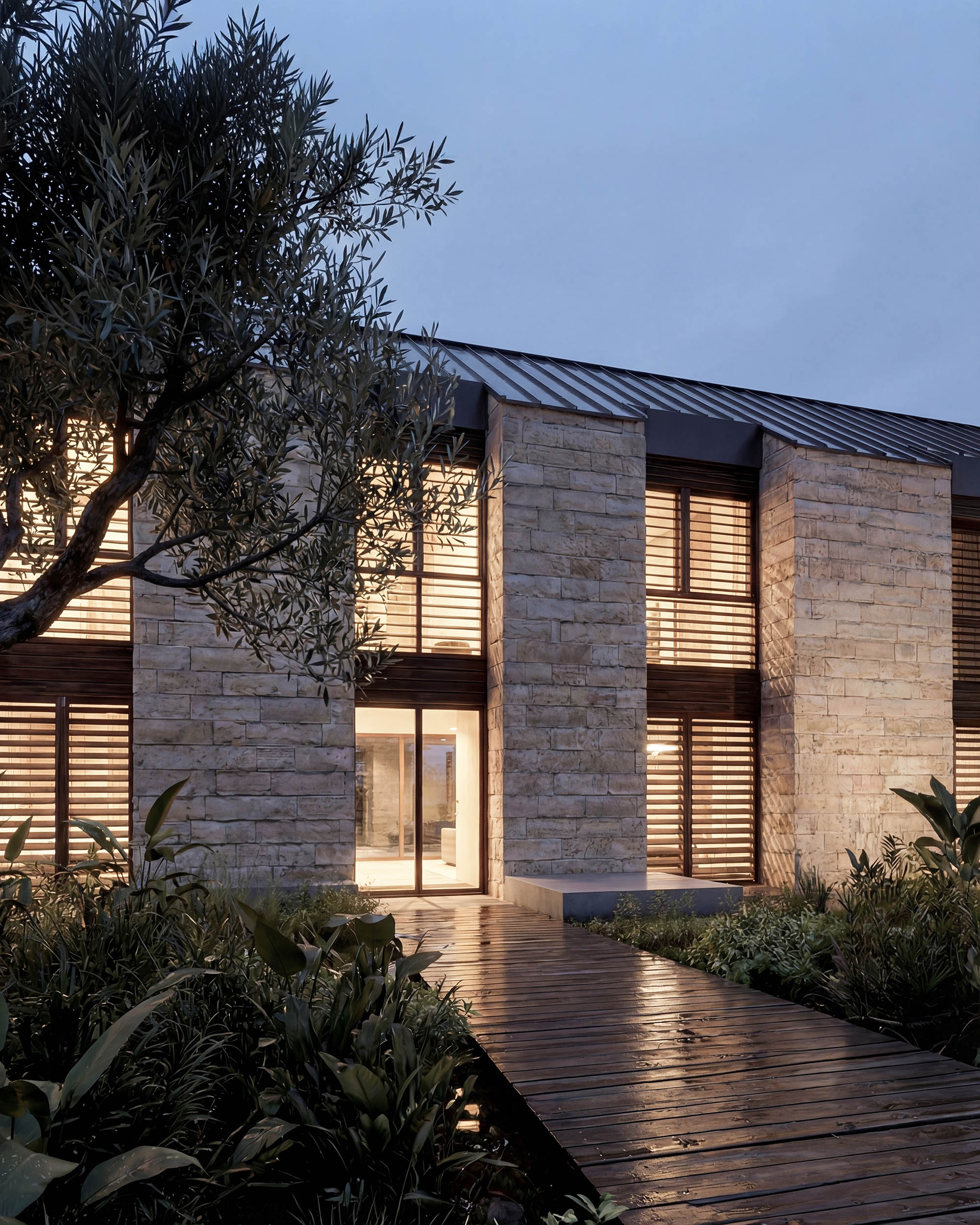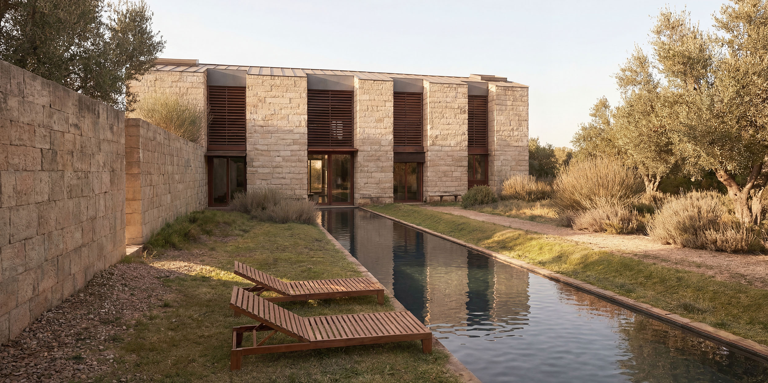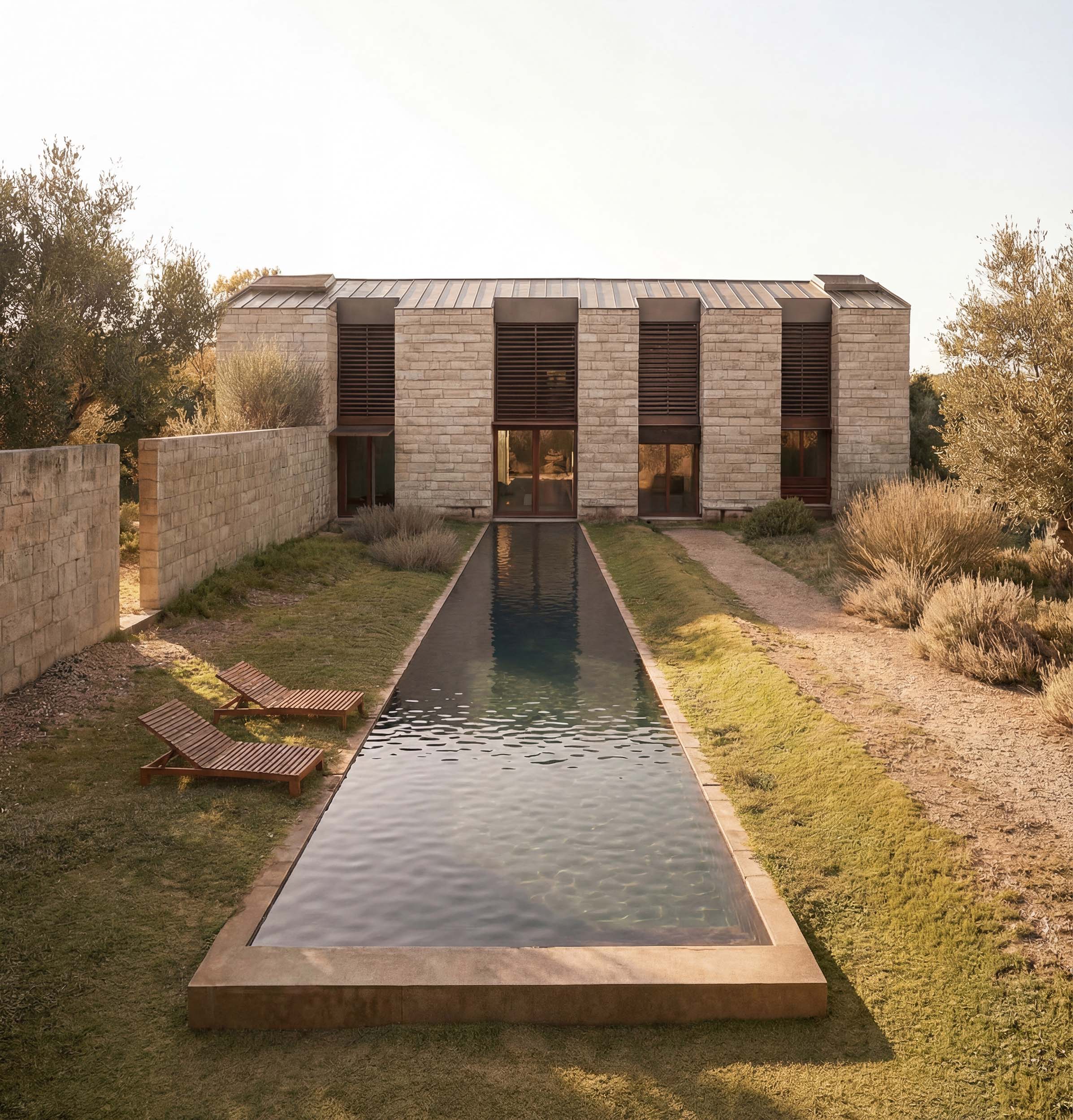 Il progetto nasce da un volume compatto in pietra, inciso da una sequenza modulare di cavedi verticali che ospitano le aperture: veri dispositivi ambientali che regolano luce, privacy e microclima. I frangisole in legno definiscono una seconda pelle dinamica, capace di filtrare il sole e garantire ombreggiamento naturale, rafforzando l’efficienza energetica dell’edificio. La distribuzione interna si ordina seguendo questa scansione: ogni vuoto genera uno spazio abitato che si affaccia sul paesaggio, mentre la compattezza muraria assicura massa, inerzia termica e protezione. Il fronte esterno non è una semplice facciata, ma una matrice performativa che costruisce anche l’esterno: pavimentazioni, vasche verdi e specchi d’acqua prolungano il ritmo architettonico a terra, creando continuità tra costruito e natura.