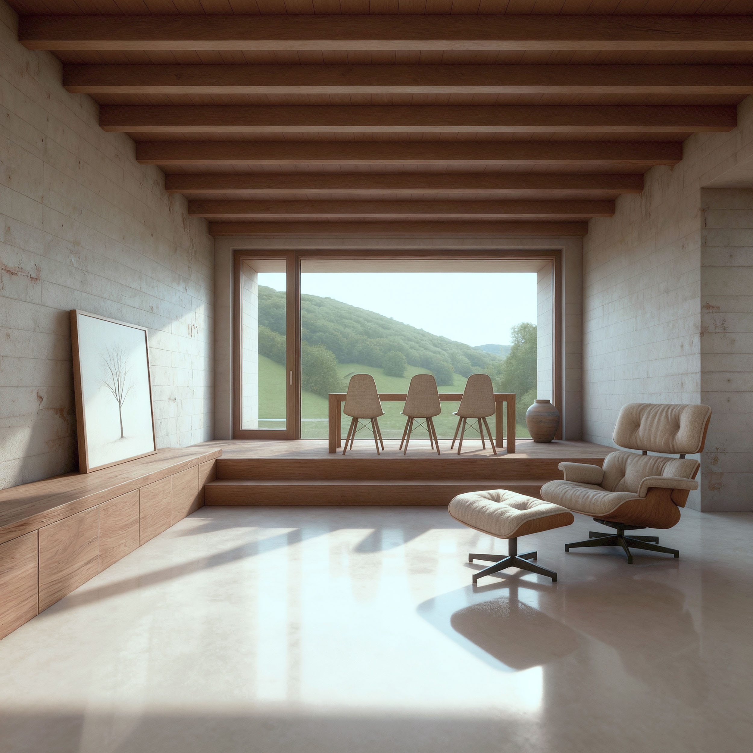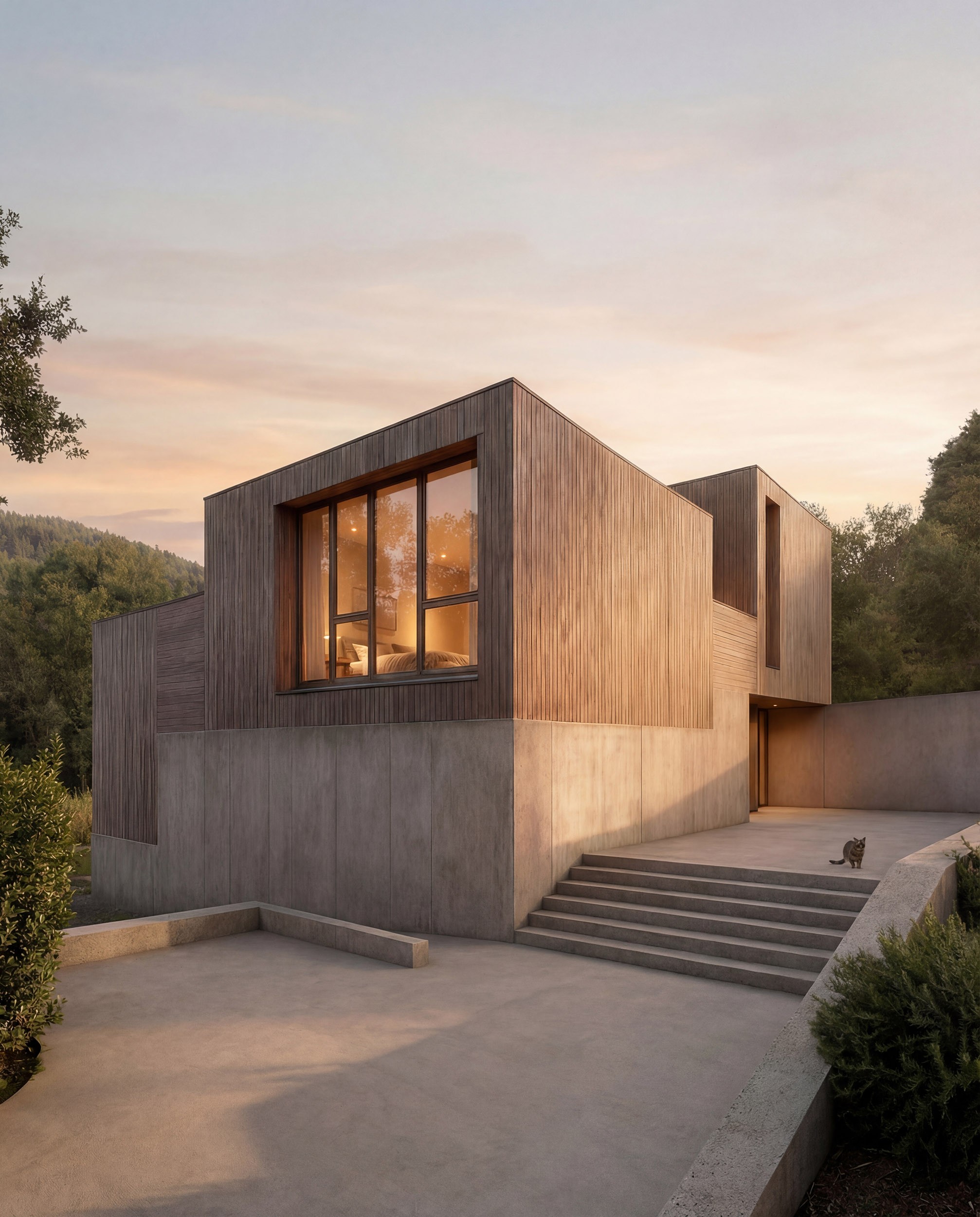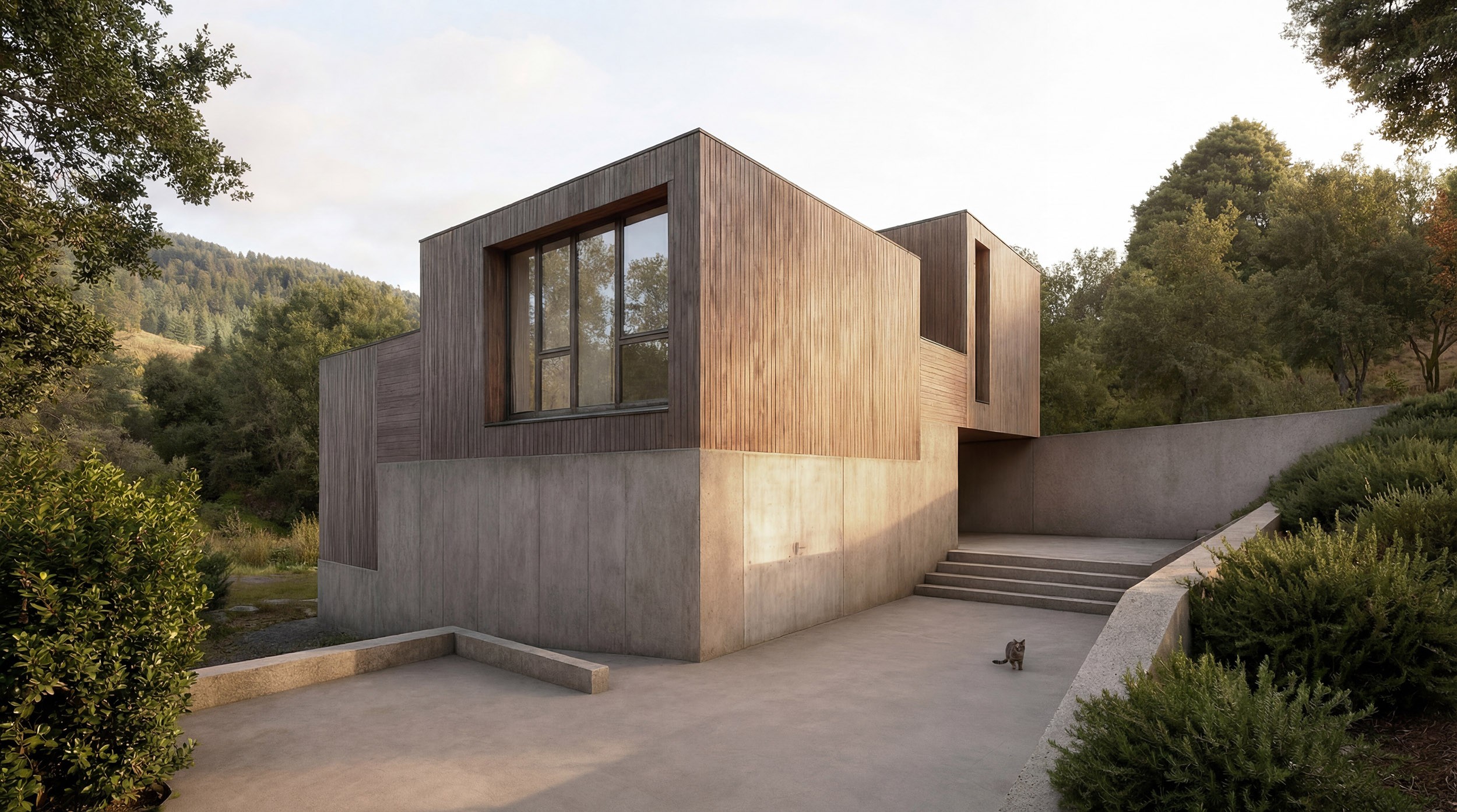 Il progetto nasce dall’equilibrio tra gravità e leggerezza: un basamento minerale, compatto e continuo, si radica al terreno come una massa geologica, mentre volumi lignei più leggeri intercettano la luce e il paesaggio. La casa si costruisce come un sistema di relazioni, dove pieni e vuoti generano profondità, ombre e affacci misurati. Le aperture non sono finestre, ma dispositivi di inquadramento che rendono il paesaggio parte dell’esperienza abitativa. All’interno, la continuità materica e la riduzione all’essenziale definiscono uno spazio controllato e silenzioso, in cui ogni scelta è necessaria e l’abitare diventa un gesto consapevole, stabile nel tempo.