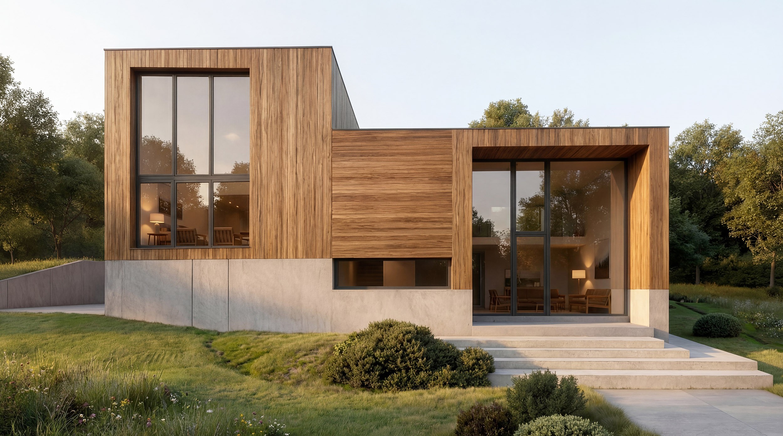 L’impianto architettonico si costruisce per sovrapposizione di volumi: un basamento in calcestruzzo, continuo e strutturale, dialoga con il terreno assorbendone le variazioni di quota, mentre i corpi lignei superiori si innestano come elementi più leggeri, orientati verso luce e paesaggio. Le aperture arretrate e profondamente incassate agiscono come dispositivi ambientali, garantendo ombreggiamento e una forte percezione di spessore. La distribuzione interna segue una sequenza di soglie e variazioni materiche che costruiscono uno spazio unitario e controllato, in cui struttura, luce e materia definiscono un’architettura coerente e durabile.