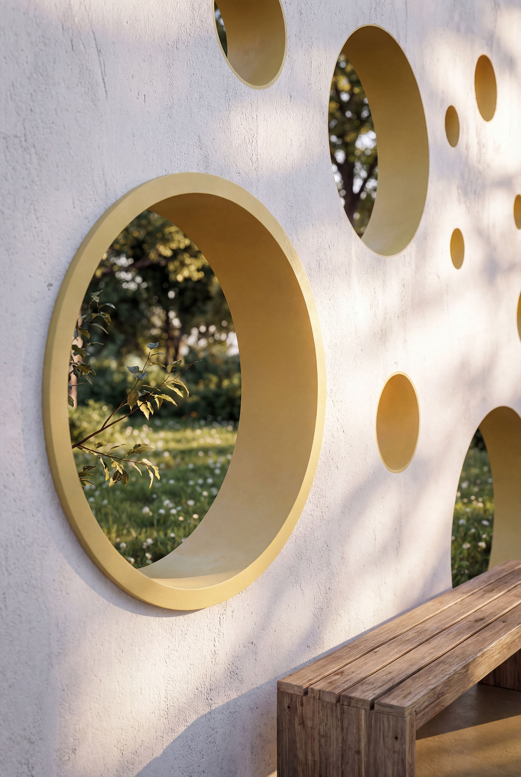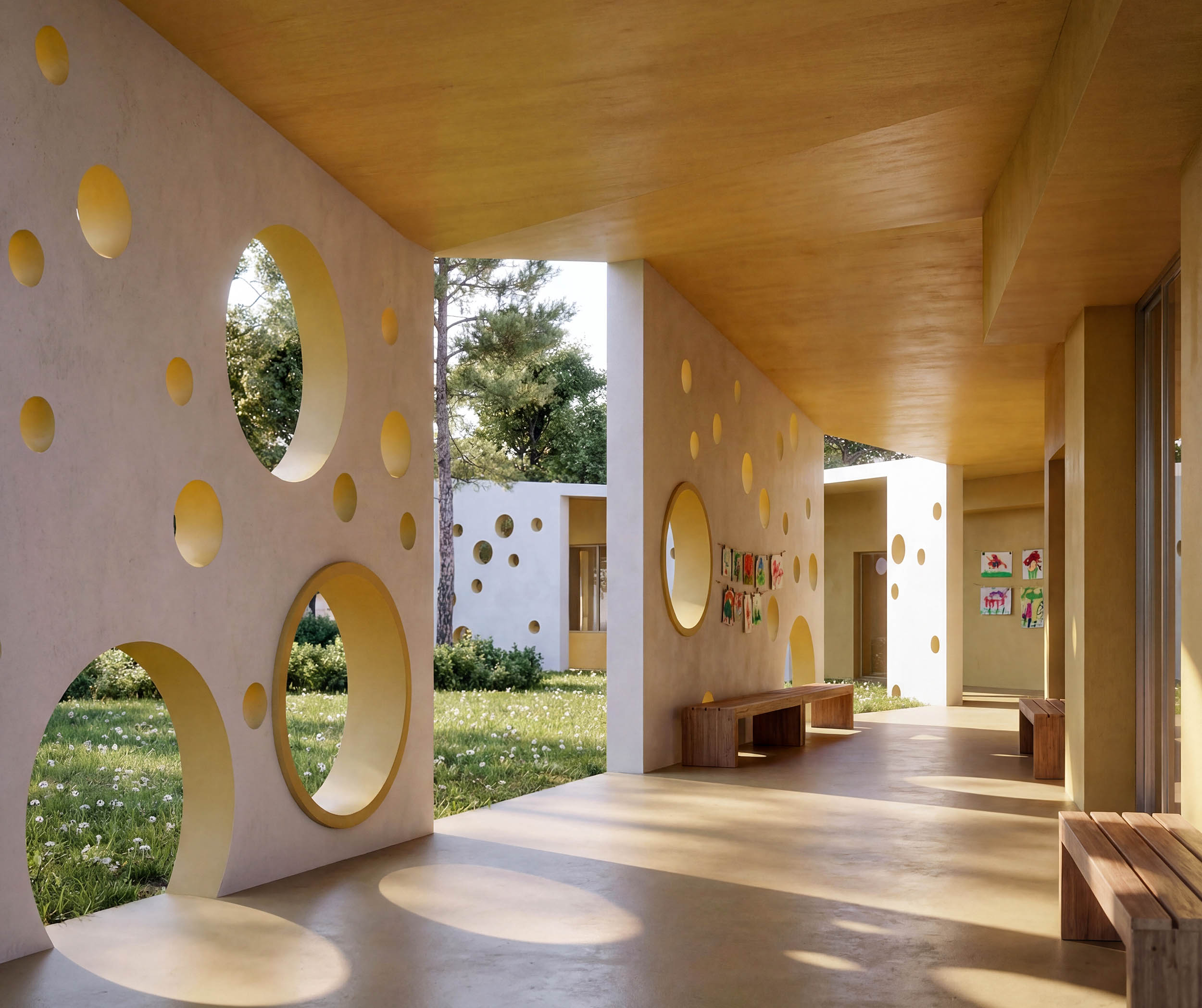 La vera magia dell'intervento risiede nei nuovi setti forati che definiscono gli spazi esterni. Non semplici muri, ma membrane permeabili studiate per dialogare con il sole: la foratura diventa uno strumento climatico che mitiga l'irraggiamento, proiettando a terra texture d'ombra in continuo mutamento. Questi spazi filtro offrono ai bambini un "vedo-non-vedo" protetto, portici sicuri dove giocare all'aperto avvolti da una luce morbida e vibrante, al riparo dal calore estivo ma in costante contatto visivo con la natura circostante.