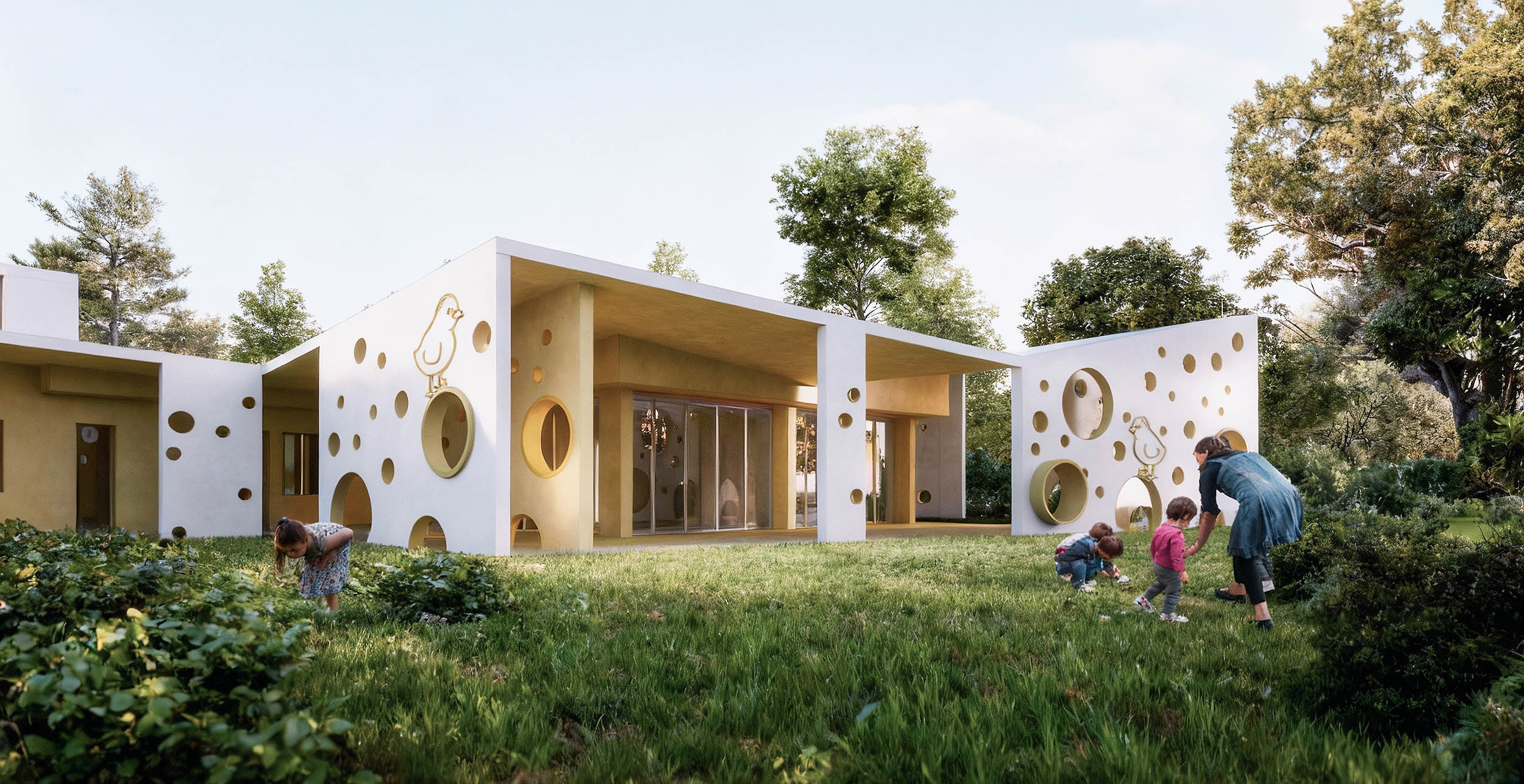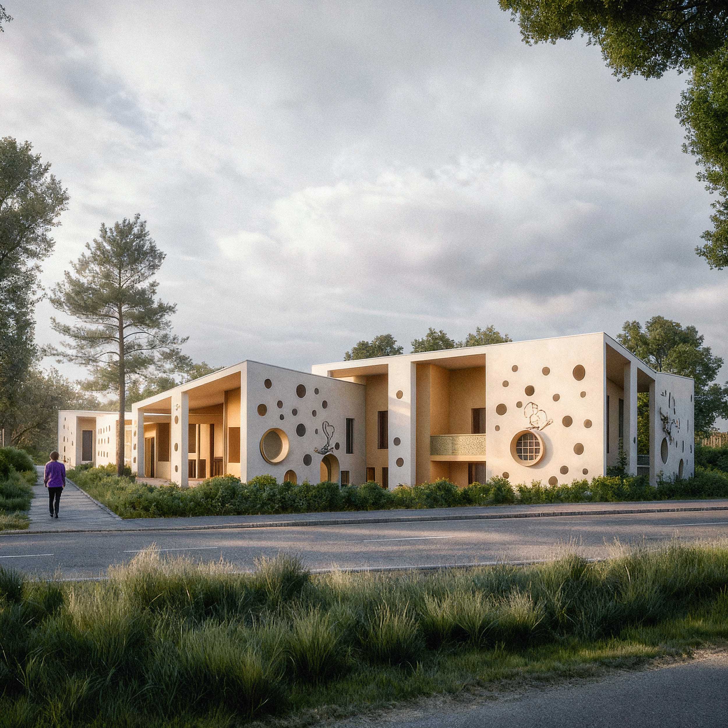 Una rinascita architettonica che avvolge l'edificio esistente in un nuovo abbraccio protettivo. La frammentazione dei vecchi volumi scompare sotto una pelle unitaria, dove la luce gioca attraverso setti forati creando un confine vibrante e permeabile tra il mondo dei bambini e il giardino.