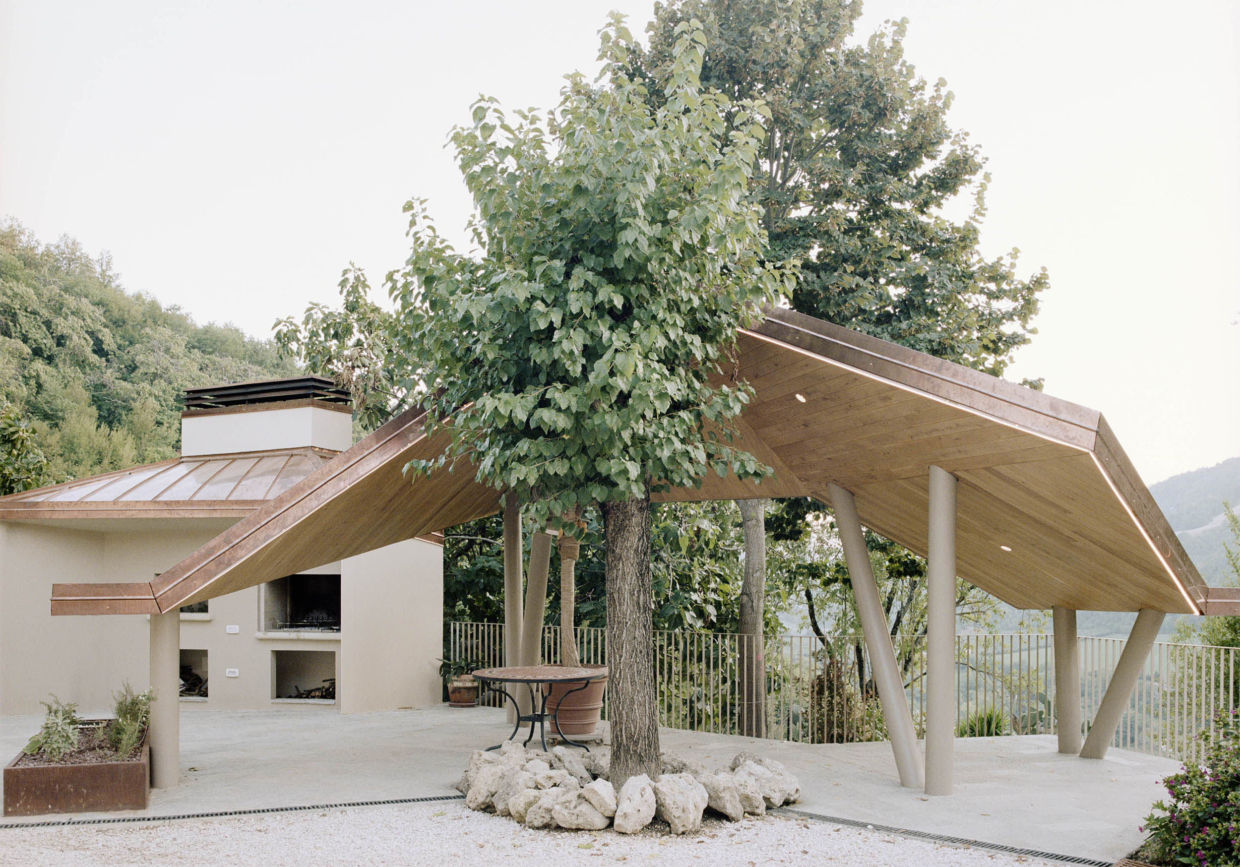Tra le colline dell’Appennino romagnolo, il progetto ridefinisce lo spazio aperto come luogo domestico a tutti gli effetti. I nuovi manufatti non si impongono come oggetti autonomi, ma costruiscono un sistema unitario fatto di soglie, coperture e ombre. La materia lignea, la luce radente e la relazione costante con il paesaggio trasformano funzioni ordinarie in un’esperienza quotidiana misurata, lenta, profondamente radicata nel luogo.