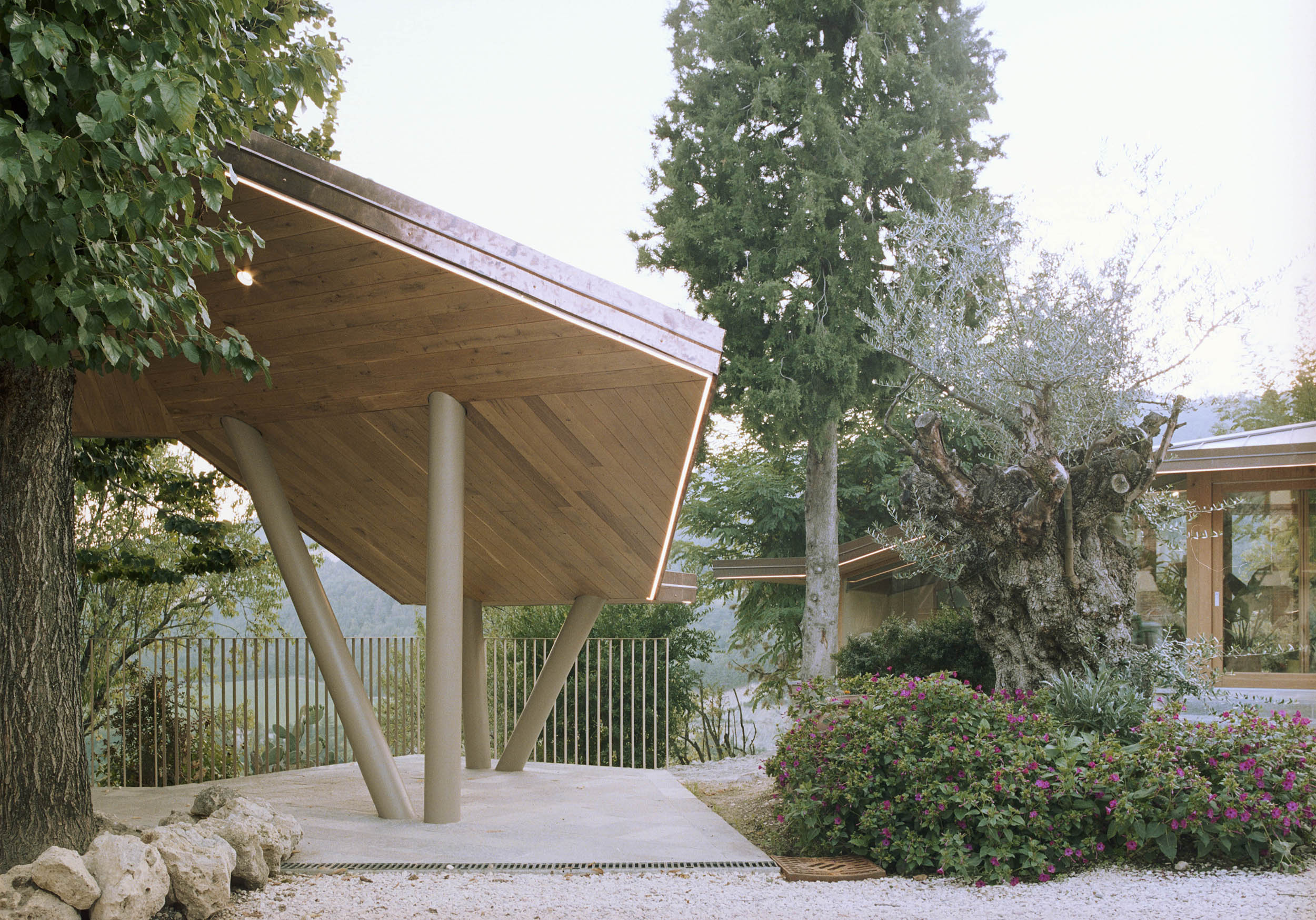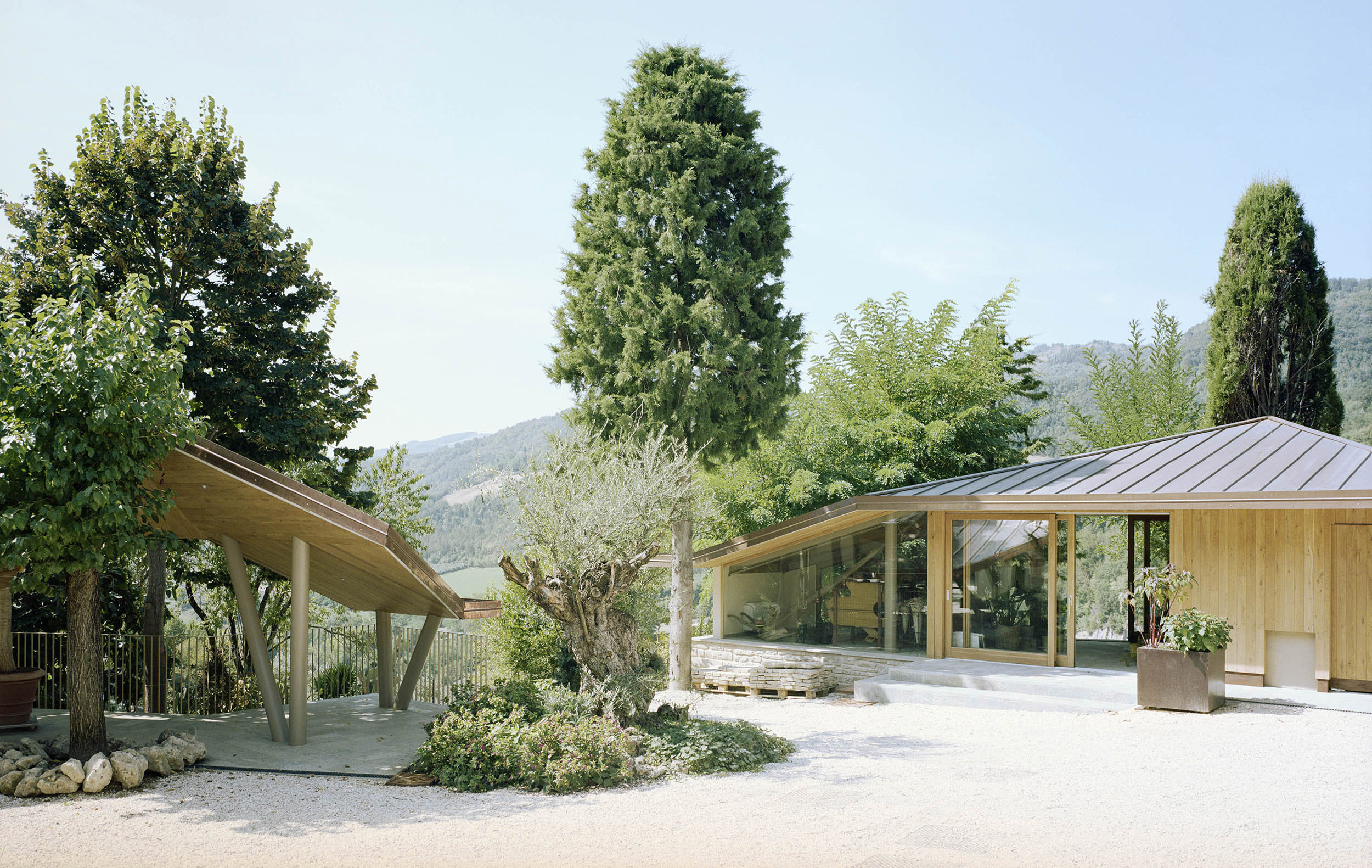 Il sistema è composto da due corpi principali di diversa lunghezza, disposti lungo il margine del pendio per definire uno spazio centrale unitario. Le strutture portanti sono concepite come telai semplici, rivestiti in listoni di rovere, con pavimentazioni in pietra di Luserna a garantire continuità materica con il suolo. Le coperture a falde in lastre di rame assumono un ruolo tettonico e percettivo, amplificando la relazione con il paesaggio e proteggendo le funzioni sottostanti. La serra, completamente vetrata, introduce un elemento di trasparenza e profondità visiva, mentre la tettoia laterale, più leggera, lavora come dispositivo climatico e sociale, capace di estendere l’uso dello spazio anche nelle stagioni intermedie.