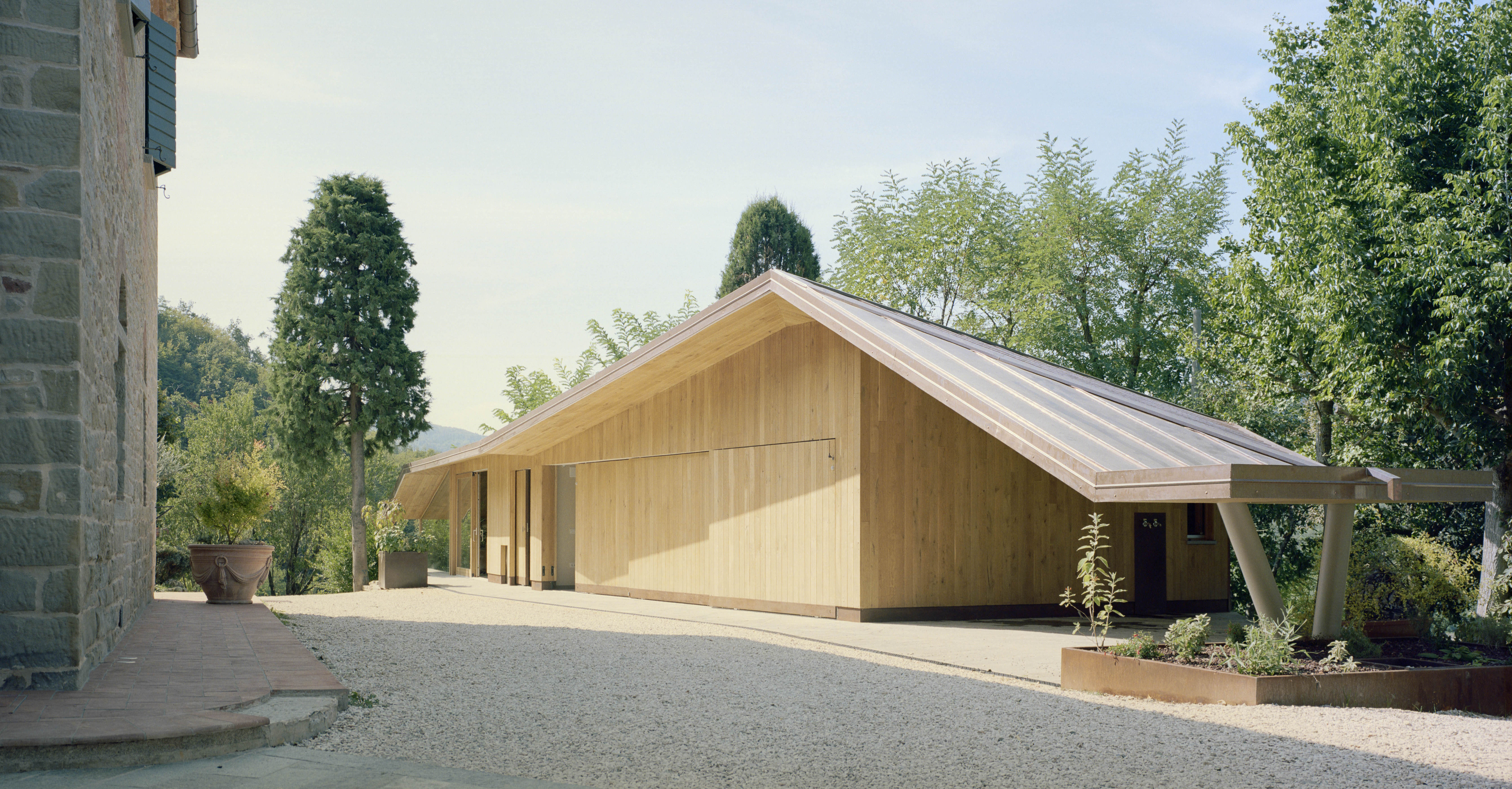 Il progetto nasce dall’idea di ricostruire un vuoto, più che di aggiungere volumi. I nuovi edifici si dispongono per definire uno spazio centrale continuo, aperto verso il paesaggio, che rievoca la logica della corte rurale senza mai chiuderla. È uno spazio attraversabile, poroso, dove le funzioni di servizio diventano parte della vita all’aperto. Le coperture inclinate, rivestite in rame, seguono e reinterpretano l’andamento delle creste collinari, mentre i fronti lignei si offrono come superfici calde, mutevoli con la luce e il passare del tempo. La tettoia più leggera si stacca dal suolo con un gesto quasi sospeso, accogliendo il tavolo e il camino come fulcro conviviale, prolungamento naturale dell’abitare domestico verso l’esterno. L’insieme non cerca monumentalità, ma equilibrio: tra costruito e natura, tra permanenza e uso quotidiano, tra protezione e apertura.